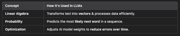 💡 AI is powered by math. But don’t worry—we’ll make it painless. LLMs like GPT-4, Claude, and Gemini may seem like magic, but at their core, they’re just gigantic mathematical engines.